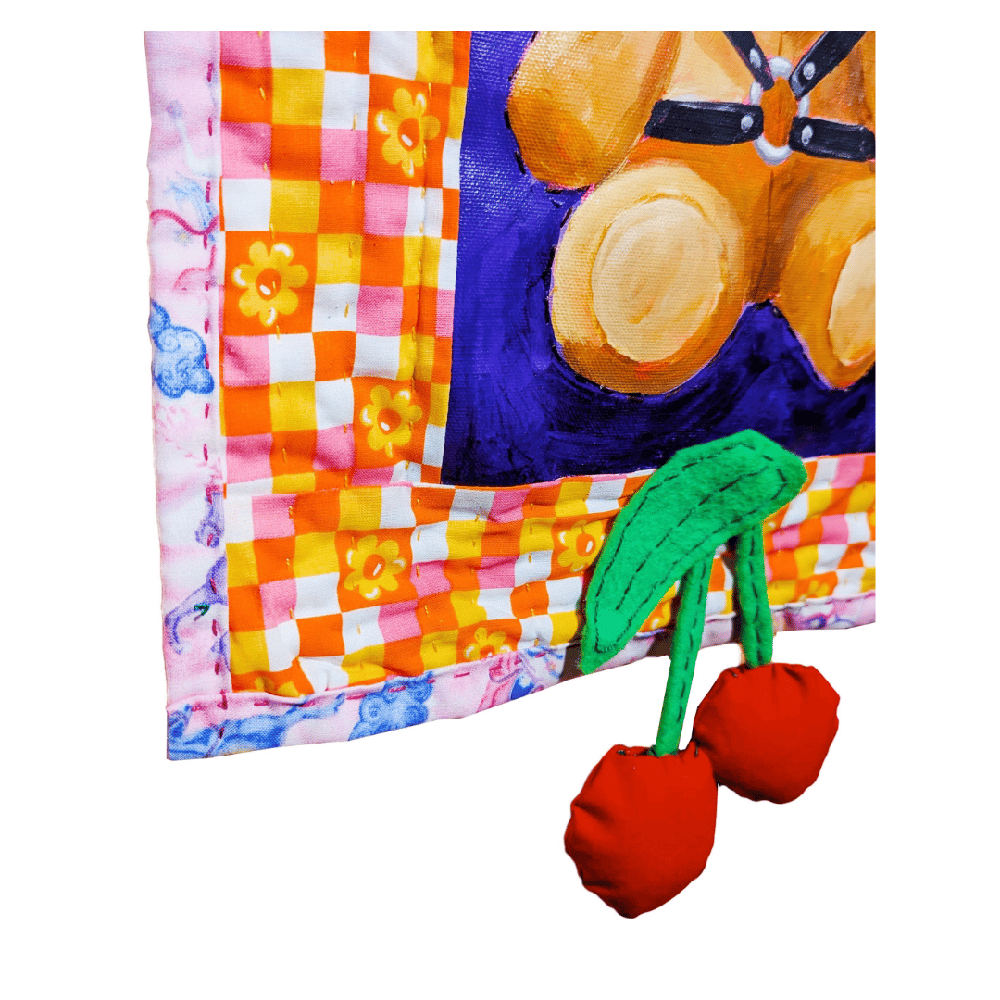 Acrylic on loose canvas, hand-quilted fabric, sewn + painted polyfill cherries